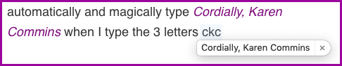 Facebook Messenger, WordPress, and other platforms don’t maintain my email signature. As pictured below, I set my keyboard text replacement to automatically and magically type Cordially, Karen Commins when I type the 3 letters ckc and press space or return.
