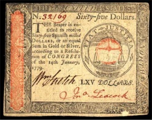 American Colonies Revolutionary War Currency (1779). Worthless paper invented by Benjamin Franklin as a way to raise money for the Revolutionary War against England.