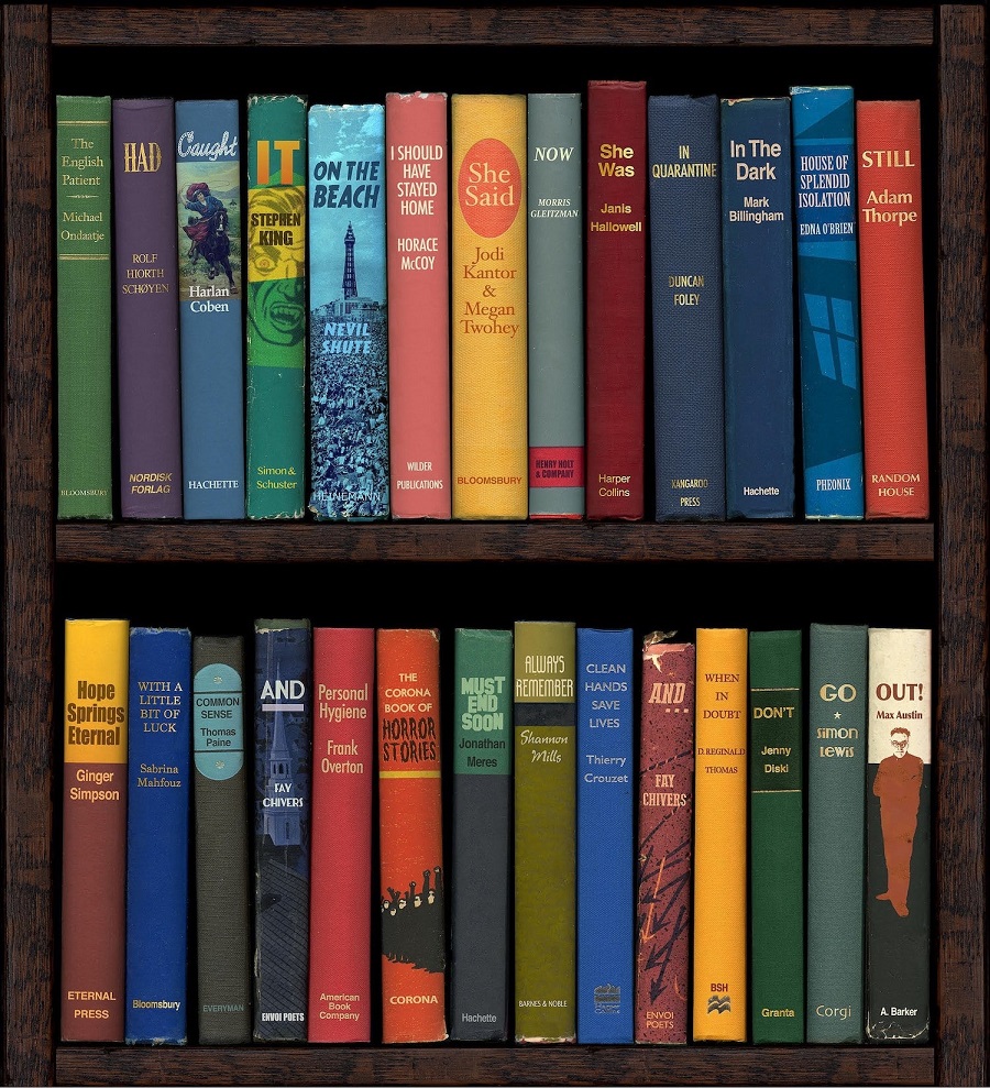 Shelf Isolation is one of Phil Shaw's distinctive bookshelf works, in which he arranges a series of genuine book-titles in an artfully-constructed digital bookcase, so that when you read them in order, from left to right, they spell out an unexpected narrative and a much needed message of hope.