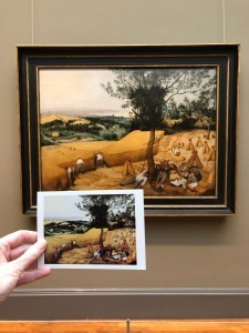 In some cases, however, the postcard version helped me to see the original painting better—for instance, by helping me to regard the work as a whole. I’d gazed at Bruegel the Elder’s masterpiece The Harvesters many times, but I’d always focused on the foreground and never quite registered the landscape in the distance, where buildings line the shore and ships float on the sea. On the postcard, I noticed that element of the painting right away.