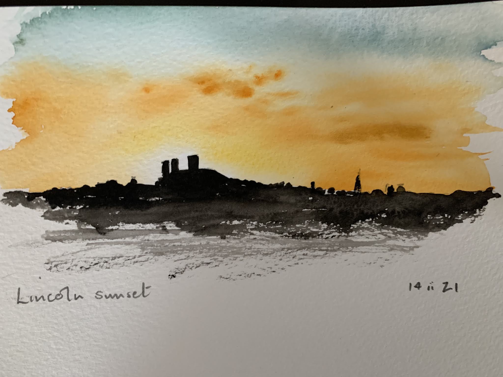 It's Lincoln cathedral in silhouette (which is the only way I can possibly depict it) in case you should be in any doubt on the matter. And I could hardly blame you if you were. Still, the effect of the setting sun works, I think. The secret seems to be leaving what you want to the brightest section of the picture blank. Not painting, in other words. Which means that the most successful effect derives from not doing anything at all.