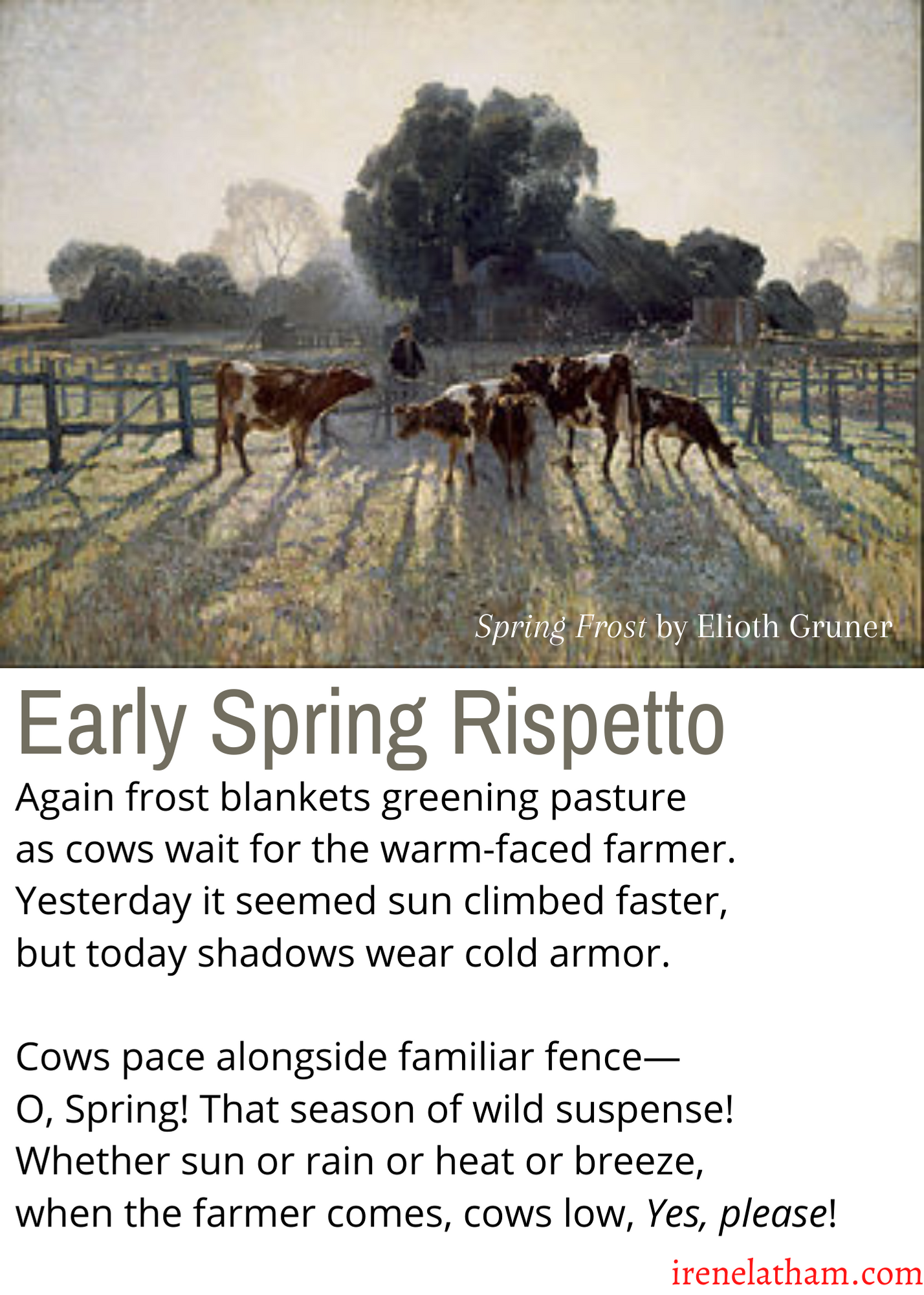 Yes, of course I wrote a new ArtSpeak: FOUR SEASONS poem... the first "spring" poem of the year. Yay! Since it's a new season, I decided to try a new-to-me poetry form. Ever heard of a rispetto?