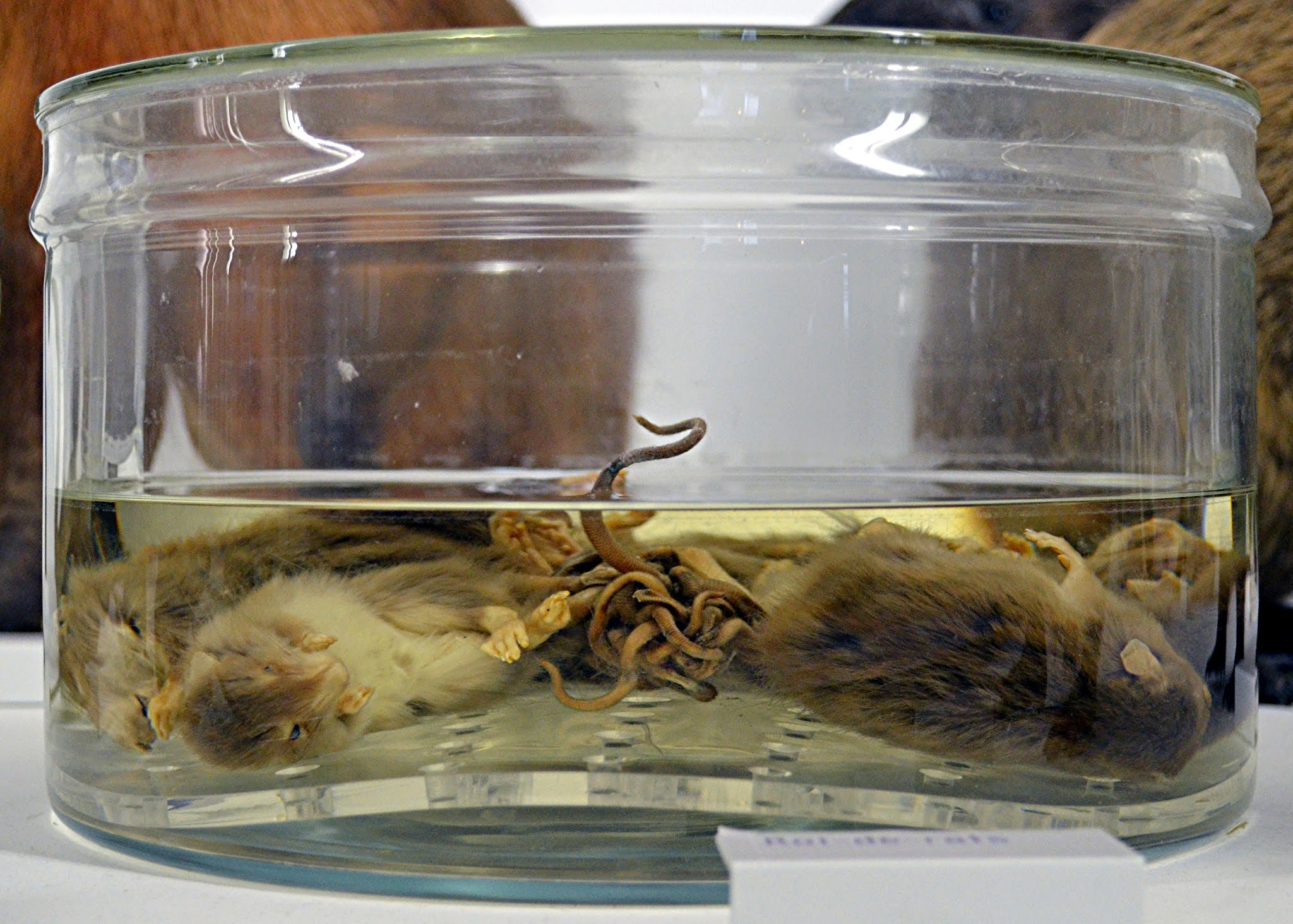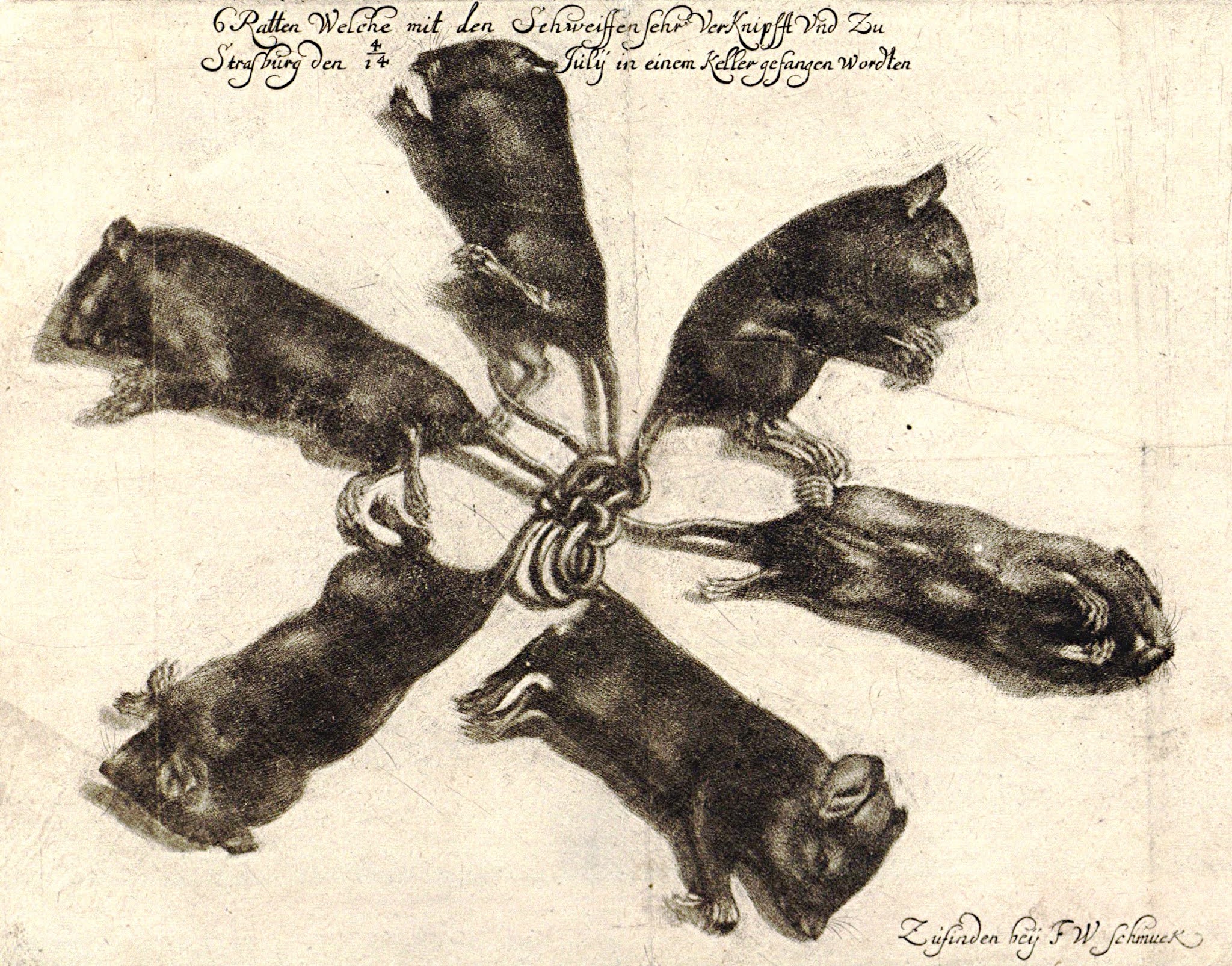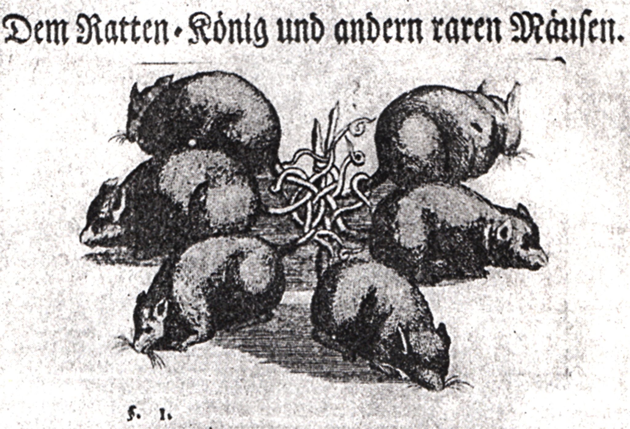 Among the most unusual but prized museum specimens are preserved aggregations of black rats Rattus rattus inextricably linked to one another by their tails - which are so thoroughly entangled that the rats have been unable to disentangle themselves and escape. A grotesque, tail-entwined aggregation of this type is termed a rat king or 'roi de rats'. This is possibly a corruption of the French 'rouet de rats' - 'rat wheel' – as the tails when straightened out radiate outwards from the central uniting knot like the spokes of a wheel radiating out from the wheel's central hub. Yet despite centuries of reports and occasional captures, the mystery of how their tails become so intertwined remains unsolved.