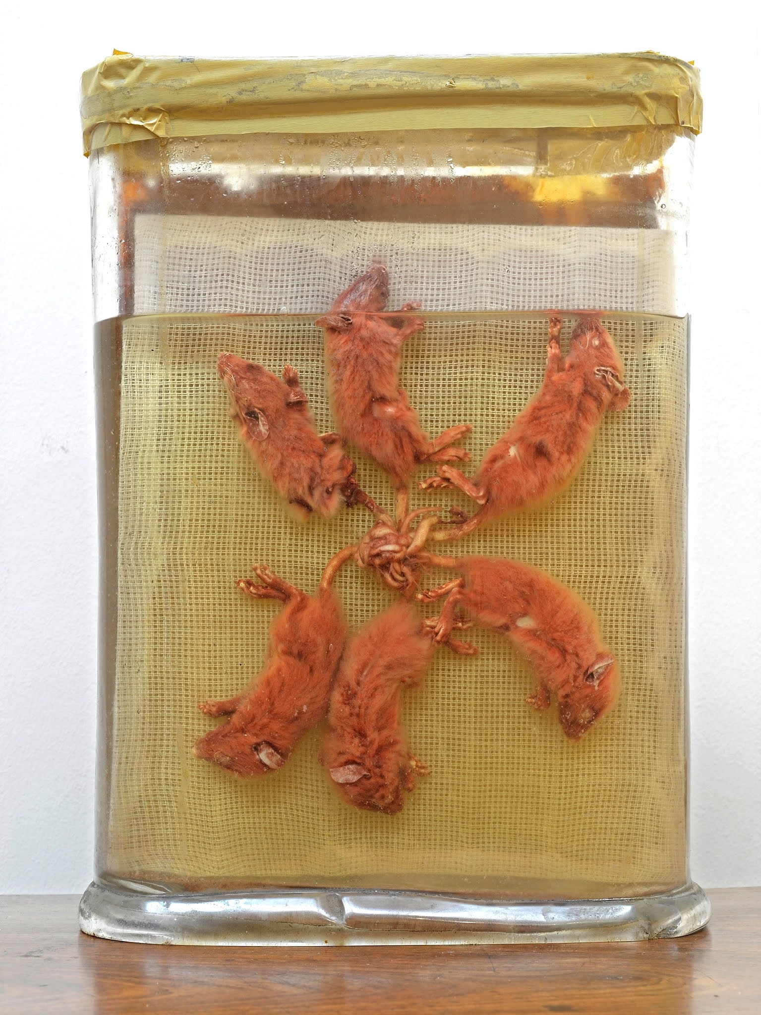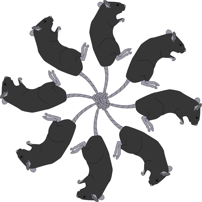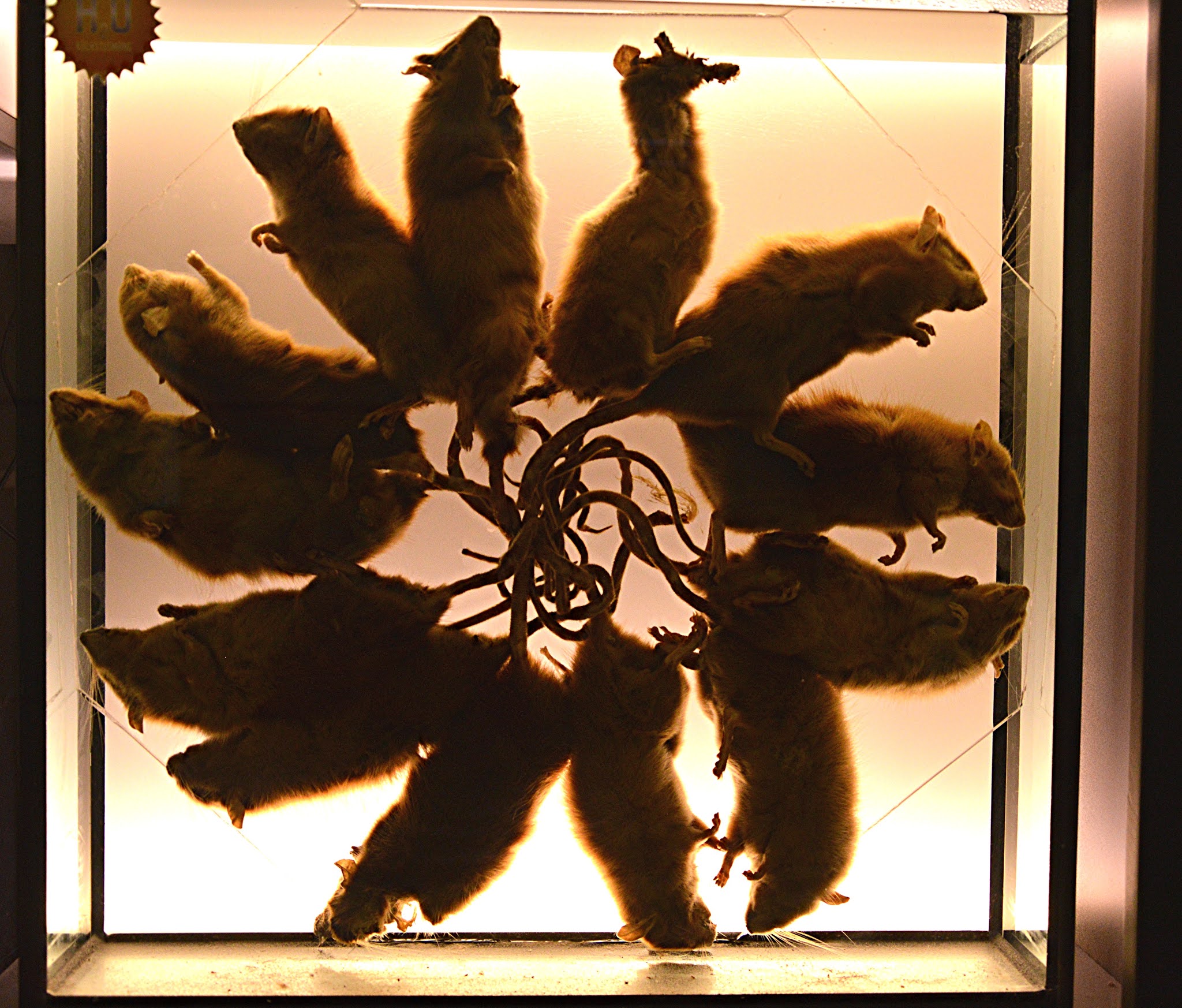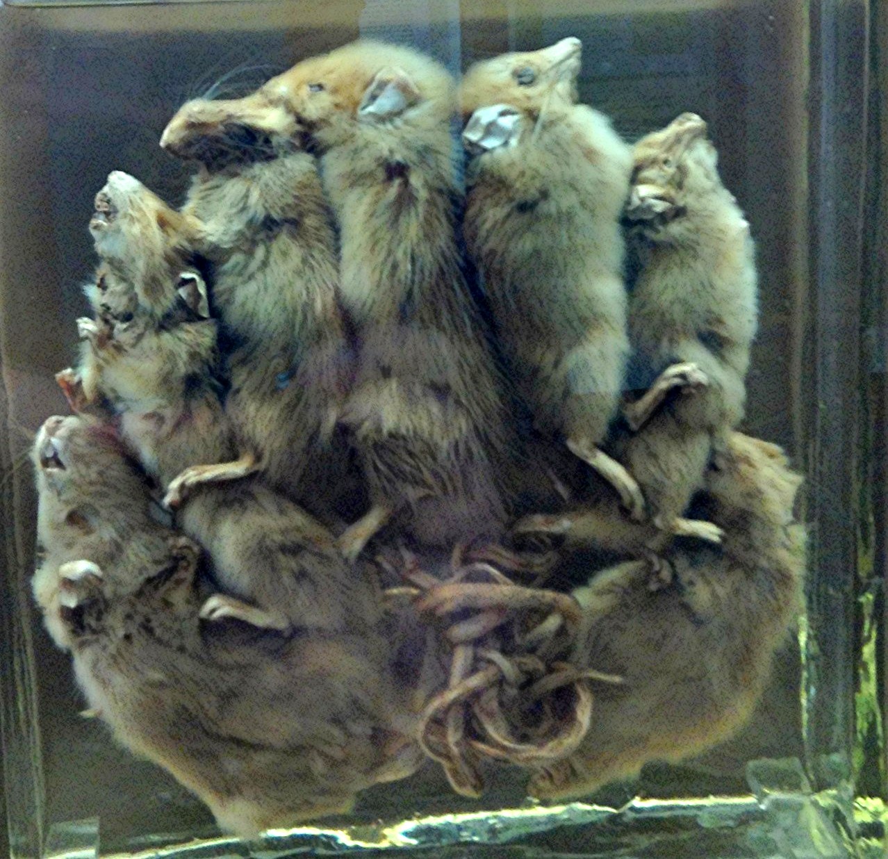 Among the most unusual but prized museum specimens are preserved aggregations of black rats Rattus rattus inextricably linked to one another by their tails - which are so thoroughly entangled that the rats have been unable to disentangle themselves and escape. A grotesque, tail-entwined aggregation of this type is termed a rat king or 'roi de rats'. This is possibly a corruption of the French 'rouet de rats' - 'rat wheel' – as the tails when straightened out radiate outwards from the central uniting knot like the spokes of a wheel radiating out from the wheel's central hub. Yet despite centuries of reports and occasional captures, the mystery of how their tails become so intertwined remains unsolved.