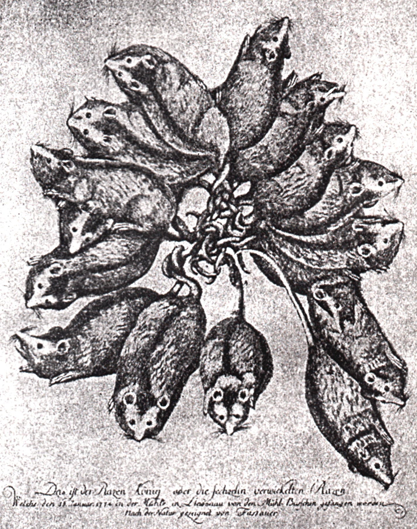 On 11/12 January 1774, an amazing 16-rat king was found in a windmill at Lindenau, Germany, with all of its rats still alive. After they had been killed, the king was subsequently displayed in Leipzig, and it proved to be a very popular attraction.