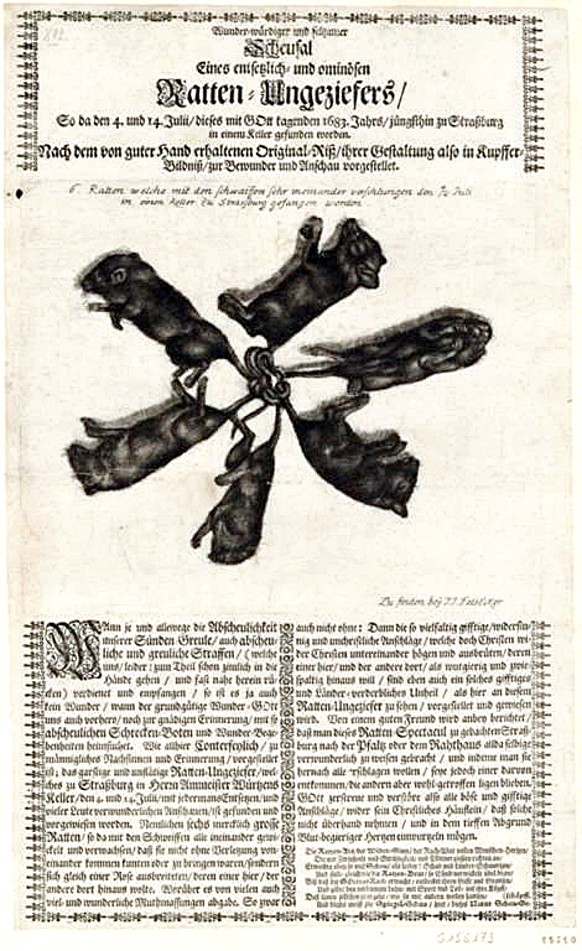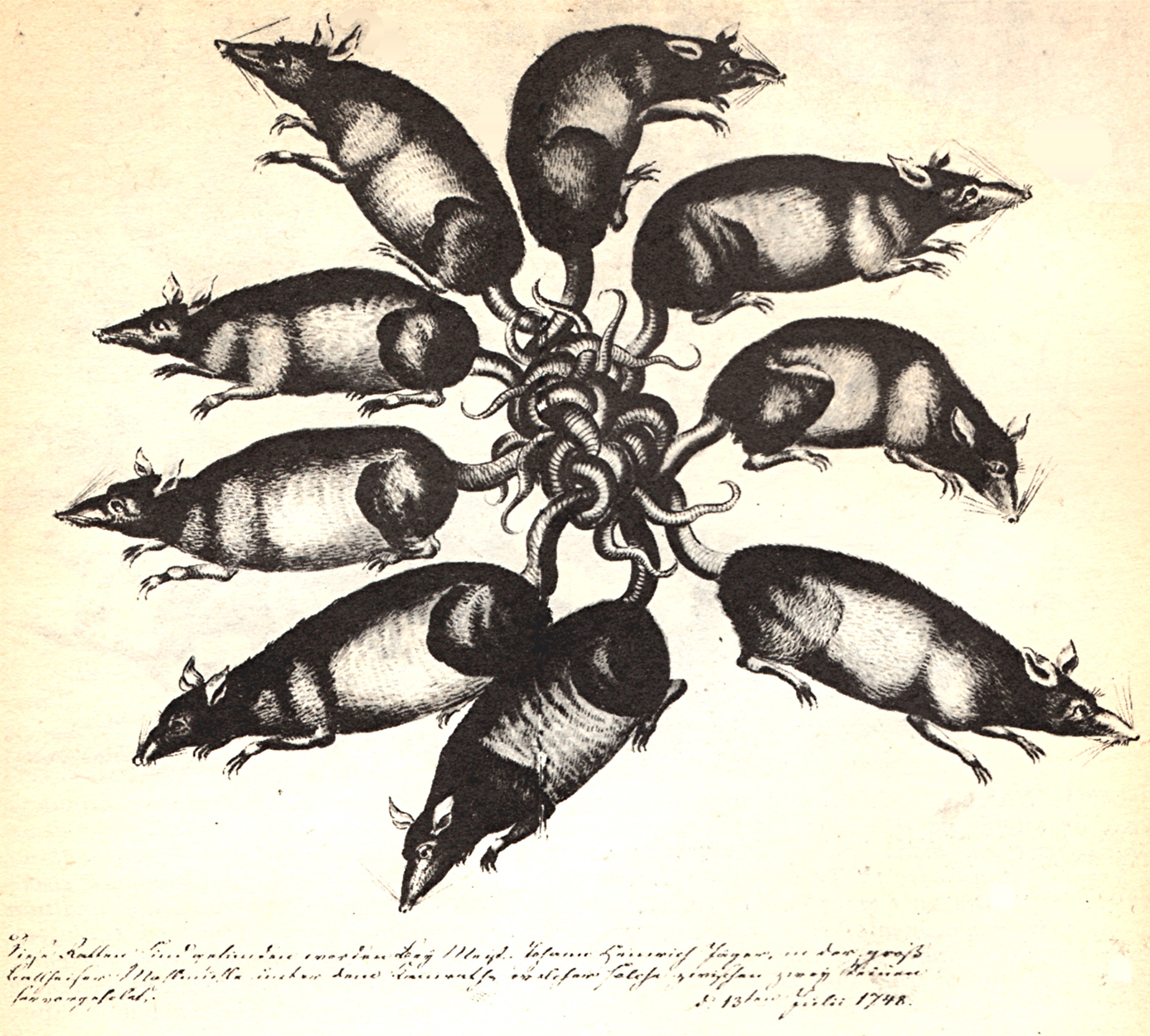 Also controversial in terms of its visual portrayal is the rat king discovered in Erfurt, Germany, in 1772. For whereas in his book Hart lists it as a 12-rat king, a detailed engraving of this example dating back to the early 1800s portrays it as containing only ten rats - but also with a very stylised, unnatural-looking knot. Consequently, this picture may have been intended merely as a general rat king representation, rather than as a specific depiction of the Erfurt example.