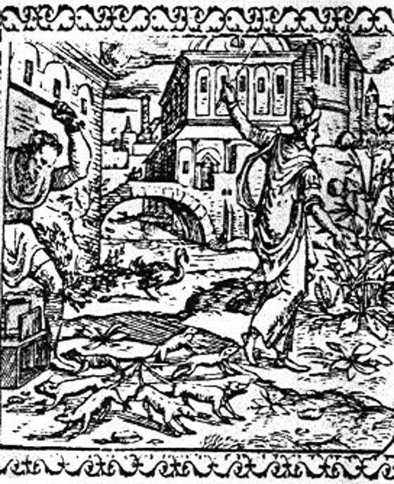 The earliest currently-documented record of a rat king dates from 1564, more than four centuries ago. It takes the form of a woodcut illustrating a poem in the monumental emblem book authored by renowned Hungarian scholar-historian Johannes Sambucus, entitled Emblemata cum aliquot nummis antiqui operis, Ioannis Sambuci Tirnaviensis Pannonii. The poem tells of a rodent-plagued man whose servant discovers seven rats with their tails inextricably tangled together, and this rat king (though not referred to by that term in the poem) is depicted as alive and in some detail within the engraving. The accuracy of the depiction shows that rat kings were known as far back as the 1500s, and suggests that it was based upon a specific example, though no written documentation of this example apparently exists.