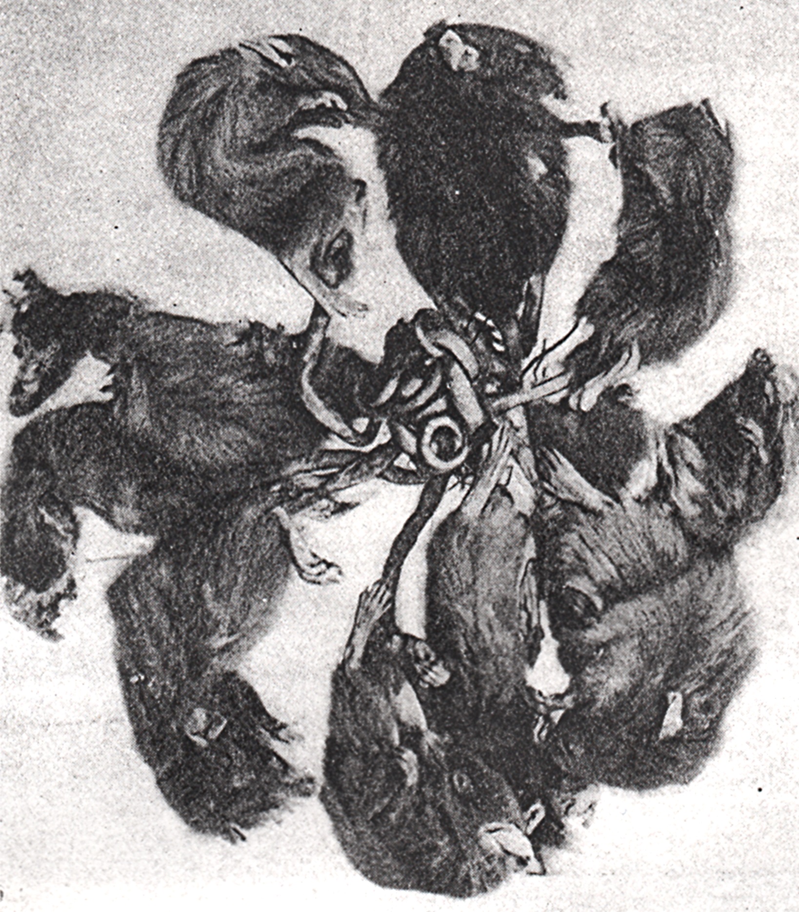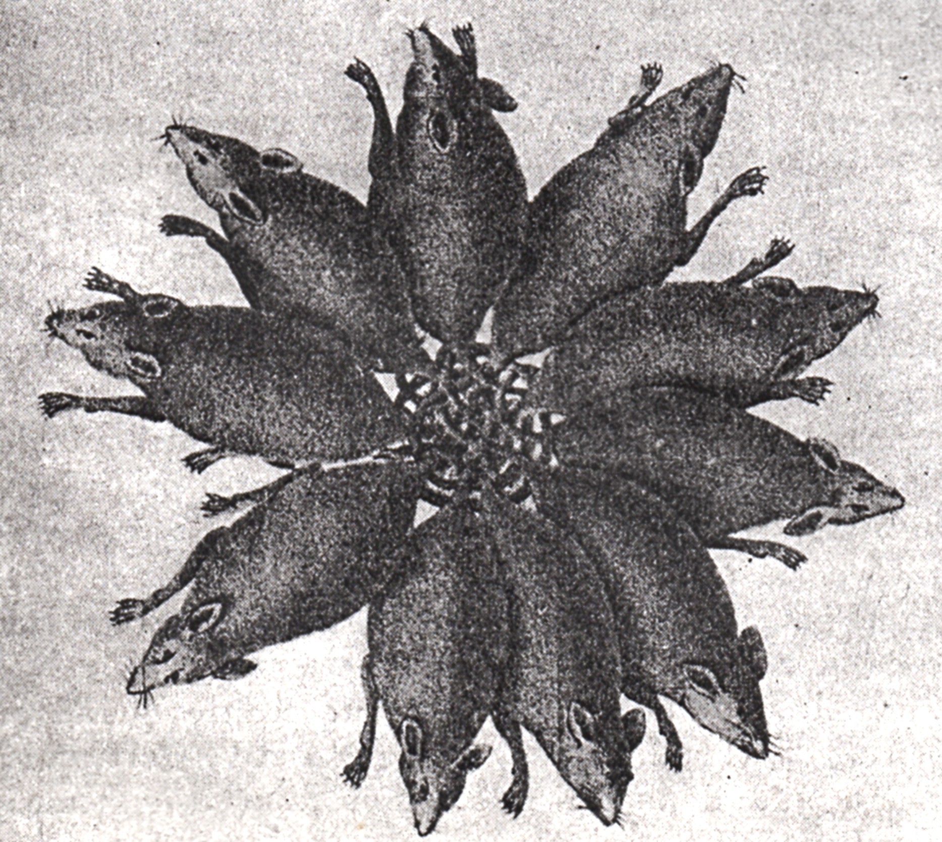 Today, the mystery of how rat kings are formed remains exactly that – an unresolved anomaly whose reality has spanned centuries but whose secret still awaits disclosure. Some sceptics have cynically suggested that the phenomenon is simply a hoax, that the knotting together of the tails of rats in a king is clearly the result of deliberate human activity. Bearing in mind, however, that most of the rat kings on record were discovered when their rats were very much alive and often still in good health (albeit hungry and frightened), and that the tail knots were exceedingly complex, all that I can say in response to these sceptics is that they have certainly never attempted to tie the tails together of several (not to mention 18 or 32!) live, healthy rats. If they were ever brave (or foolish) enough to try to do so, their cynicism would very swiftly vanish – along, quite possibly, with several of their fingers!