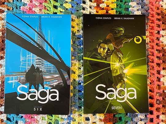 Currently reading – Saga, Volumes 6 and 7, by Fiona Staples and Brian K. Vaughan. Fiona Staples is an Eisner Award winning Canadian artist and Brian K. Vaughan is an Eisner Award winning writer. Almost done with this series.