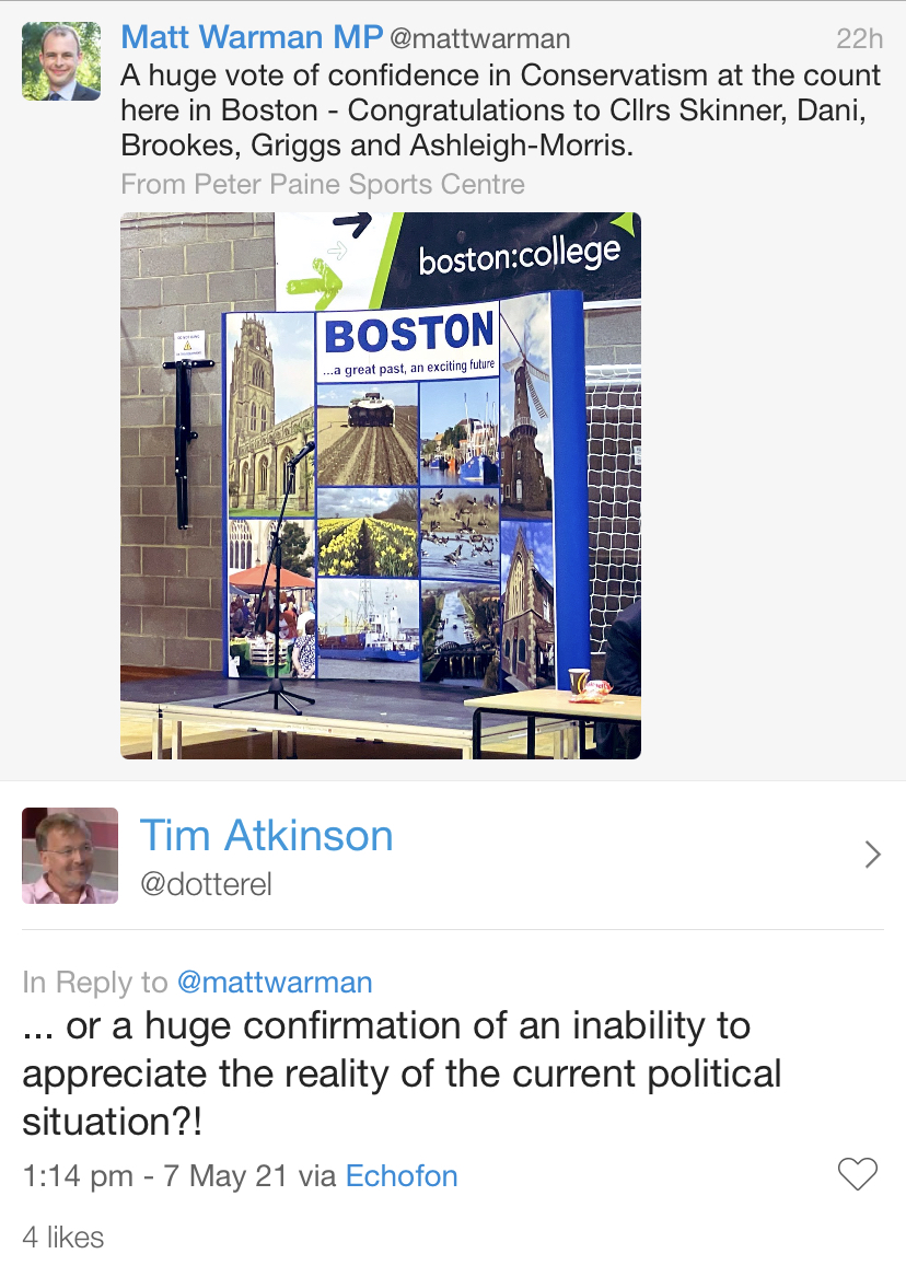 I hadn't held my breath. I nearly didn't vote, for what would've been the first time in my life. There really didn't seem much point in turning out to vote against a sitting Tory councillor certain to be re-elected (so certain that -- in common with the Tory council leader -- he seems incapable of replying to emails). Of course the equally secure sitting MP had to crow about it all on Twitter: