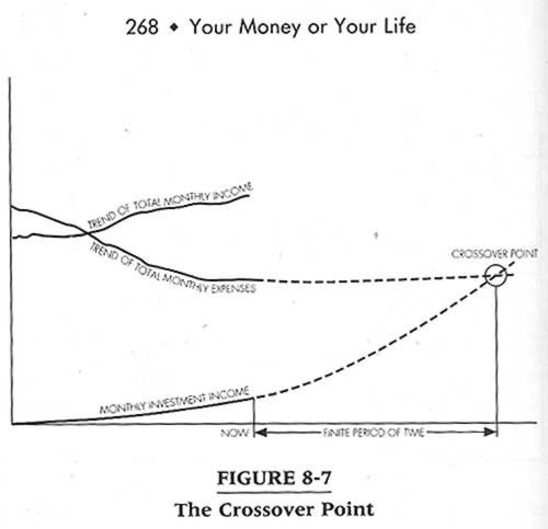 The entire book is about finding ways to get the investment income line (low on the graph) to meet (and then cross over) the expenses line. At this "crossover point", investment income exceeds monthly expenses. The authors write: