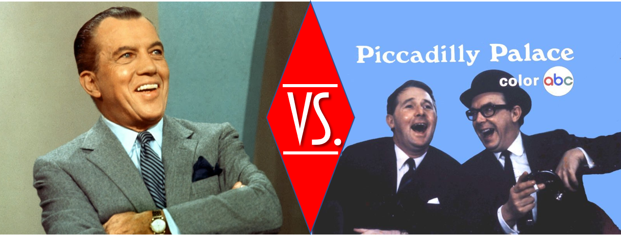 No surprise that finding something interesting about this matchup should be a challenge. Wait, I know—Nancy Ames, the singing act on Sullivan, used to be the singer on NBC's That Was The Week That Was, which was a spinoff of a hit British show, which is where this week's Piccadilly Palace comes from.
