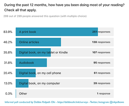 Thanks to all who responded to my Reading Habits poll! I've posted the results below. Please keep in mind that this survey was informal and in no way meant to be an accurate reflection of the industry as a whole. You can see my other informal surveys and polls here.