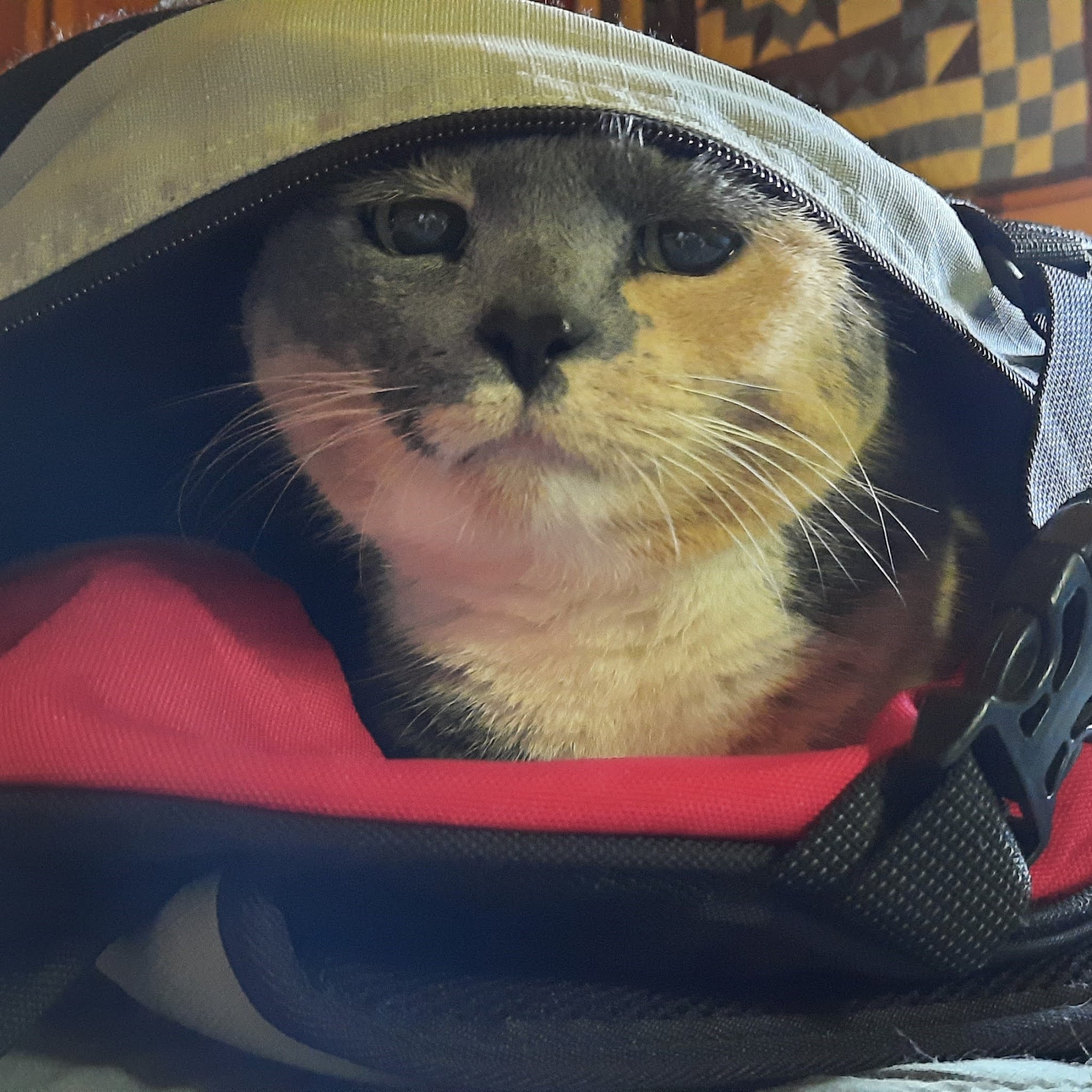 I haven't yet mentioned Kensi. She has embraced the idea of having her human home all the time. She was not exactly happy when we abandoned her. As soon as I dumped the contents from my backpack, she climbed in. And this is the expression I've been dealing with ever since.
