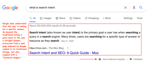However, starting in 2015-16, Google started to implement more advanced search features that give specific answers to users beyond the traditional listings. Thus, Google pretty much extracts content from web pages, and with queries that resemble more of a question: