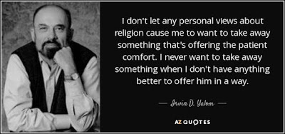 "Η ομιλία μου θα επικεντρωθεί στα θέματα που ξεπηδούν από αυτά τα αντικρουόμενα συναισθήματα και ιδίως σε κάποια υπαρξιακά θεραπευτικά ζητήματα τα οποία συχνά θεωρούνται θρησκευτικής φύσεως. Θα σκιαγραφήσω επίσης κάποιες συγκρίσεις ανάμεσα στην υπαρξιακή ψυχοθεραπεία και τη θρησκευτική παρηγοριά. Πιστεύω ότι τις δύο αυτές προσεγγίσεις τις συνδέει μια σύνθετη και τεταμένη σχέση. Κατά μια έννοια είναι ξαδέλφια, έχουν τους ίδιους προγόνους και τις ίδιες μέριμνες. Μοιράζονται μια κοινή αποστολή: διακονούν την απόγνωση, που είναι εγγενής στην ανθρώπινη μοίρα. Μερικές φορές έχουν κοινές μεθόδους - την προσωπική δυαδική σχέση, τη διαδικασία της εξομολόγησης, της εσωτερικής εξερεύνησης, της συγχώρησης των άλλων και του εαυτού. [...]"