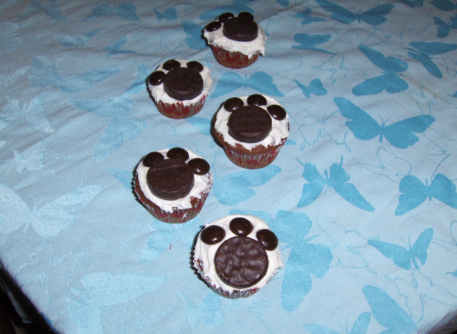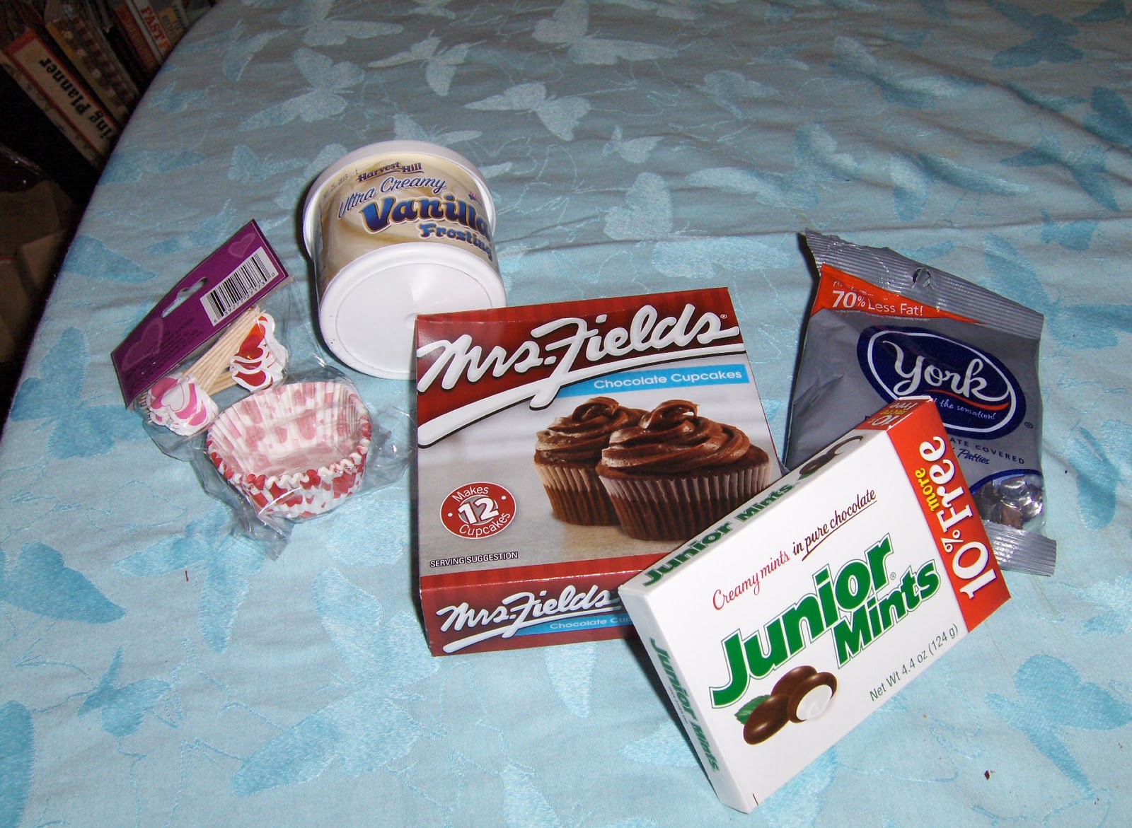 All of the ingredients for these "Cub Cakes" were purchased at my local Dollar Tree store. Some Dollar Tree stores now have refrigerated sections and would also carry the eggs needed for the cupcake batter. Mine doesn't, but it does carry the vegetable oil needed.Make cupcakes in the flavor of your choice. Top with vanilla icing. Place a miniature York Peppermint Patty slightly off-center on top of each cupcake and arrange three Junior Mints around the top edge to form the paw. If you'd like, chocolate chip "claws" and be added to the tips of the Junior Mints. Chocolate chips may also be used in place of the Junior Mints for a more wolf-like animal track. In fact, if you'd like to substitute a Mickey or Minnie Mouse theme, you could just remove one Junior Mint and arrange the mints in the familiar Mickey silhouette. So easy! Enjoy!