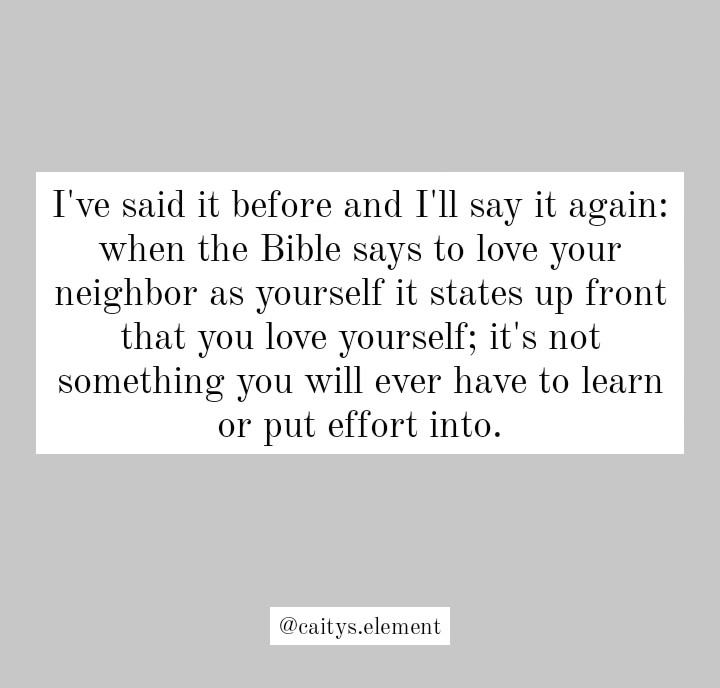 I've said it before and I'll say it again: when the Bible says to love your neighbor as yourself it states up front that you love yourself; it's not something you will ever have to learn or put effort into.