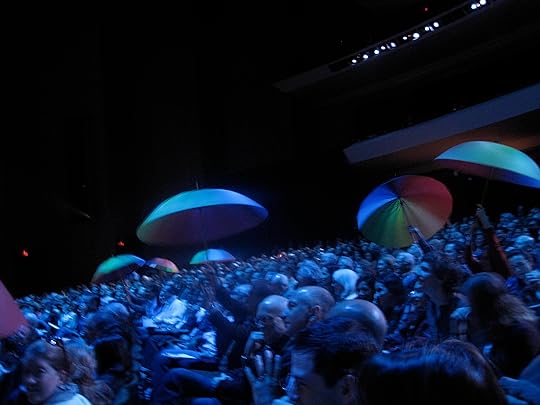 Scattered audience members opened rainbow umbrellas and began spinning them. And then people in rainbow bodysuits and with rainbow hair ran out on stage and fired rainbow streamers out of a cannon. And then the beach balls rained down from the balcony.