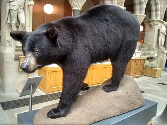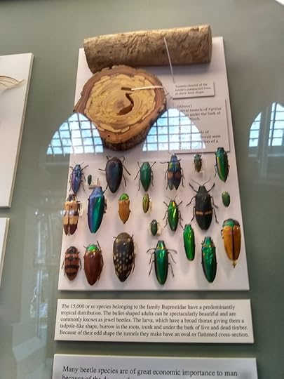 The huge ground-floor gallery is informative and modern but it’s also true to its roots. Its stories evoke the excitement and wonder that Victorian scientists must have felt as they made new discoveries and challenged existing views of the world. Indeed the newly opened museum was the site of an infamous, furious debate between Thomas Huxley arguing in favour of Darwin’s theory of evolution and Bishop Samuel Wilberforce arguing vociferously against the idea that mankind is descended from apes. And I could not ignore the contrast between the Victorian industrial confidence of this building and the little cottage museum in Shaftesbury with its tales of families made destitute by that very same Victorian industrial thrust. There was much to think about and I enjoyed wandering around, imagining myself in a crinoline and soaking up the atmosphere as I stopped by displays in no particular order—craggy fossils, a giant Japanese spider crab that is the stuff of nightmares and measures over three metres across, and a sad display about dodos. Close to the entrance is a stuffed North American black bear, its glossy pelt so thick that it was as much as I could do not to sink my hands into its depth. Years of ‘Don’t Touch’ signs had conditioned me and so I didn’t, but later I read that visitors are encouraged to touch many of the exhibits here including the bear. I wish I had. But I did stand eye to glassy eye with an aardvark and then had a conversation with Mike about when and where to meet for a cup of tea. It took a little while to realise the incongruity of having such a mundane discussion while standing on opposite sides of a life-sized cast of a Tyrannosaurus Rex. Nearby were the skeletons of an African elephant and a giraffe, both fully-grown and huge in their own right but dwarfed by the prehistoric animal. Upstairs were displays of insects. There were tiny fleas and ticks, and big beetles so exquisite that it was hard to believe they were not enamelled. I moved my head from side to side to get the full iridescent splendour and the label informed me that one in three of all insect species is a beetle.