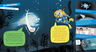 The facts and the illustrations really work together in this book. I think the information could have been a little advanced for Margo, but the clever illustrations help make the facts easier to understand. Plus, my sister loves how bright and vibrant the pictures are throughout the book. There are lots of details and humor involved in the illustrations, which helps me to remember the information, and they make my sister laugh out loud. She can't get over a fish wearing a bib and having a fork and knife. I have to admit, the words and the pictures make the book fun and informative. The sidebars on the sides of each page add extra facts and scientific terms, which I really soaked up.