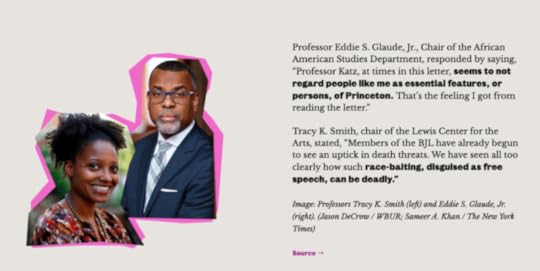 This is jaw-dropping stuff. Princeton University is in effect accusing a sitting professor of being an anti-black racist. The university directs incoming freshmen to read that website, in which Prof. Katz is introduced to them as one of the most evil people on campus, while the revolting race-baiter Eddie Glaude is held up as an aggrieved victim of Katz. I hope Katz has contacted a lawyer about this.