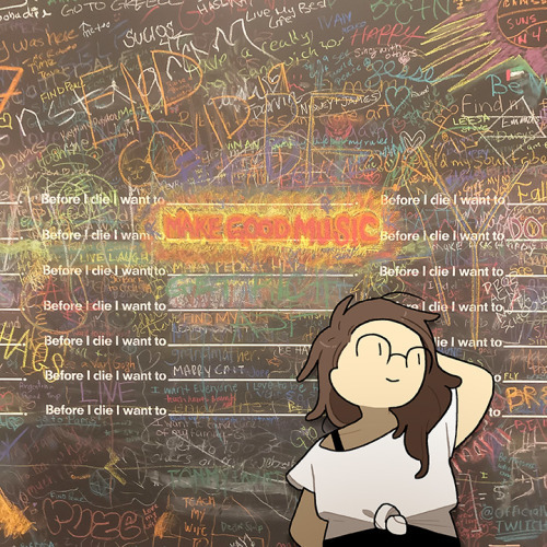 Description: A picture of a giant chalkboard. Pre-written on the board are the lines: ‘Before I die I want to:’ and then a space where people are encourage to contribute their goals. The whole board is full of words. In front of it all is an illustration of myself, standing and looking to the side.