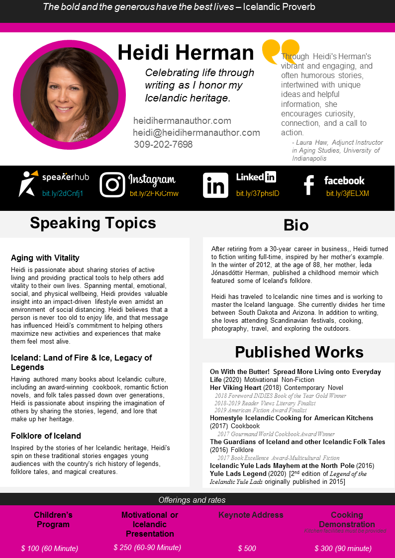 I have created a new presentation - Aging with Vitality - that blends together some of the ideas from my book, On With the Butter! with five principles of Scandinavian philosophies. This is a great session for Scandinavian Clubs, Community Groups, and Library events.