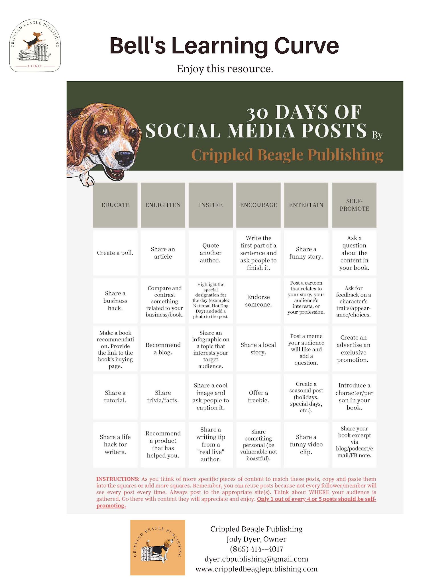 Stay in the Crippled Beagle Publishing loop. Follow me, Jody Dyer, and my business on Facebook, Instagram, LinkedIn, and Pinterest. Simply search CRIPPLED BEAGLE PUBLISHING. If you'd like to receive weekly tips and inspiration on writing, editing, publishing, and marketing books, email me: jody@crippledbeaglepublishing.com.