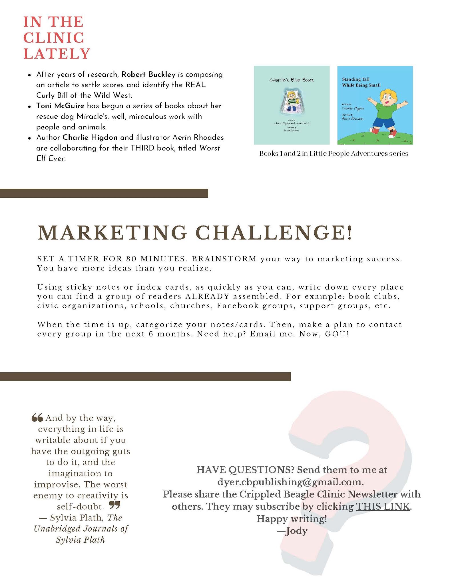 If you want a .pdf copy of the newsletter or have questions about anything related to writing and publishing, email me at dyer.cbpublishing@gmail.com. Thank you for trusting me with your time and ideas.