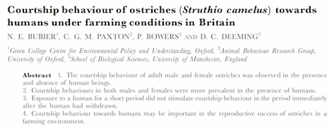 That, friends, is what led to publication of the study "Courtship Behaviour of Ostriches Towards Humans Under Farming Conditions in Britain," which in turn led to the awarding of the 2002 Ig Nobel Prize in biology to the scientists.