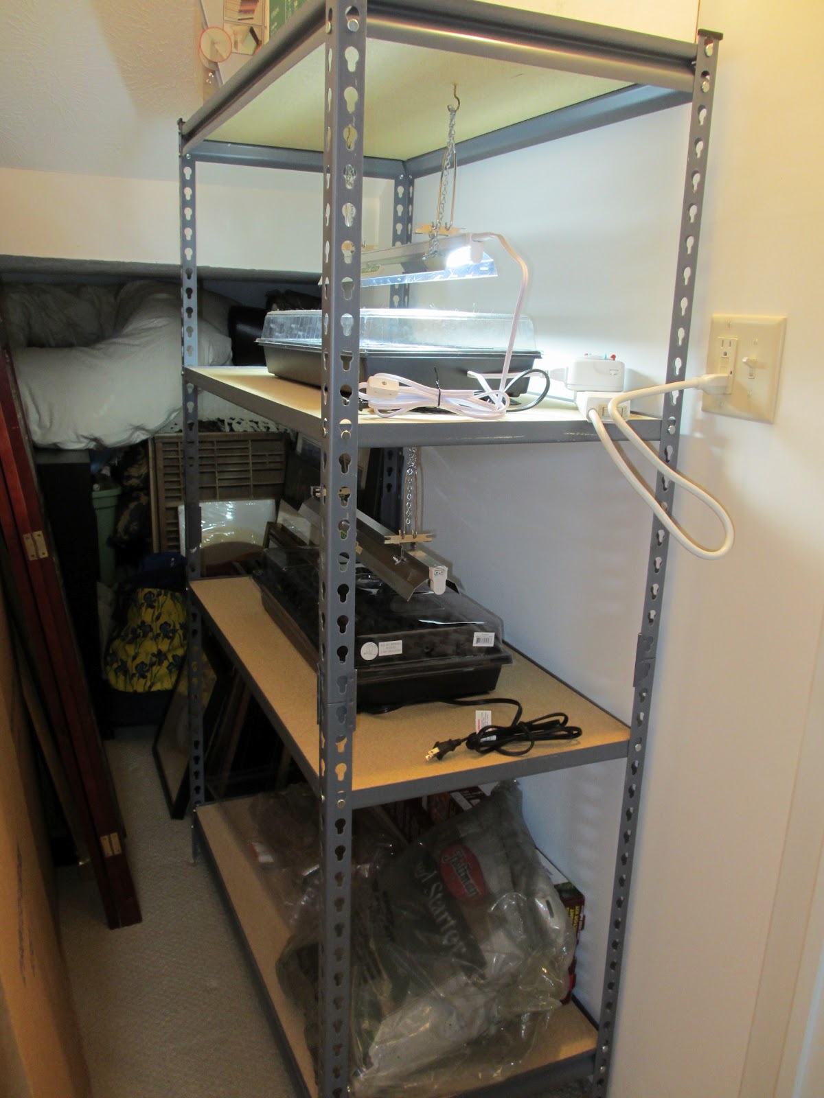 My wife helped me reorganize the closet under the stairs so I could fit in a grow station. It's my first ever. I've two shelves, with one to expand on, two T5 lights at 6400K, heat pads, timer, and fan. Even soil-less potting soil. Hopefully, in a few weeks I'll some native perennial seedlings to hand out at Lincoln's Earth Day, where my garden coaching business will be (coneflowers, aster, goldenrod, liatris, milkweed). Also may start some veg--I'm virginal with that, too.