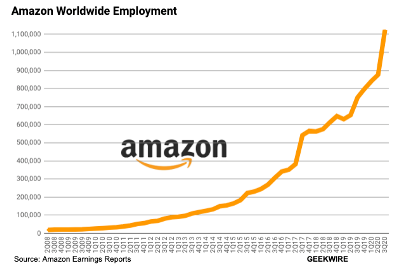 Those numbers mean that we can expect in the next few years some unionization of the relationships between employees and Amazon (and potentially some struggles too), and also that any decision taken by Amazon HR regarding general policies will have far-ranging effects on local economies. Amazon also certainly is developing its political influence where unemployment is a major local issue.