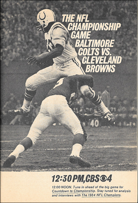 ," which knocked the MVP of last year's title game out for the rest of this one. As a side note, NBC's new contract with the AFL, one that provides the upstart league with financial security, begins in 1965; until the start of Monday Night Football in 1970, this will be the final pro football telecast by ABC.