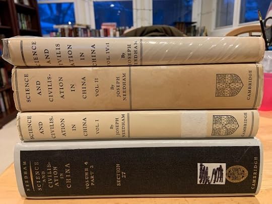 I’d never heard of Jospeh Needham until reading Simon Winchester’s book The Man Who Loved China–a book that I’ve read twice now. I’m fascinated by Chinese history because I know so little about it, but what really attracted me to this series (besides its title words “science” and “civilization”) is Needham himself. I’m amazed by people who can spend their entire careers on a diving deeply into a single subject. It’s what fascinated me, in part, about Will and Ariel Durant’s Story of Civilization and Dumas Malone’s 6-volume biography Jefferson and His Times. There are many volumes to Needham’s series and they are hard to come by, but I’ve managed to acquire four of them, which is enough to get me started, once I’m ready.