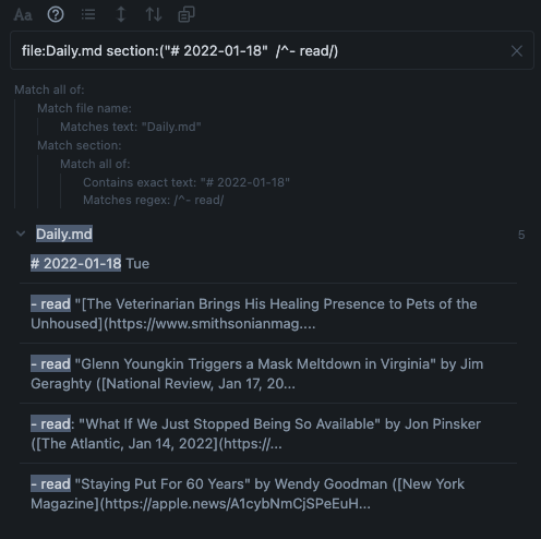 which returns all of the lines in my daily notes file within the “2022-01-18” section that begin with “- read” (I’ve included the explanation as part of the search):
