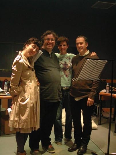 It's a wrap, loves. Angus Deayton was our last guest of the Mr Blue Sky recording. He was helicoptered in to play an urbane Catholic priest in just one episode, which comprised three scenes that he unsurprisingly nailed. It must have been weird for him to turn up at 4.30 on the last day of a gruelling seven-day record and find bodies, Pret wrappers and discarded copies of OK! and G2 everywhere, and fellow actors in advanced states of hysteria and sleep deprivation. But he is a sport and picked his way delicately through the carnage. Greg Davies came in earlier and promised to put his scenes as the Customs Official (another spoiler!) in the can in one take. I won't say whether or not he did, but he won the crown for the most swearing in the studio. And being the tallest, obviously, but that's true wherever he goes outside of the Harlem Globetrotters. There was a lot of man in the room when he was in there with Mark and Justin.