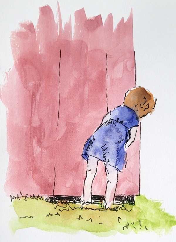 Somehow that wasn’t sufficient, though, and when I got home I got out my sketchbook, pen and watercolors and went looking for a “location photo.” I found this little girl and drew her very quickly, as I would have to do if she were standing in front of me. Total time, including the paint, was no more than two minutes. But this was enough to ease my frustration at least for the day.