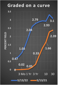 Next, check out today���s yield curve, which is the blue line. Across the board, interest rates have climbed, pushing down the price of existing bonds. But here���s the deal: Beyond about three years, the yield available on Treasury bonds flattens out. Yields in the three-year vicinity are 2.79%, while at 10 years they���re just 2.93%. There is a 3.32% yield at the 20-year mark. But to earn that yield, one that's just 0.53 percentage point higher than three-year Treasurys, you have to take an awful lot of interest-rate risk. After all, the iShares 20+ Year Treasury Bond ETF (TLT) is down 21.3% in 2022.