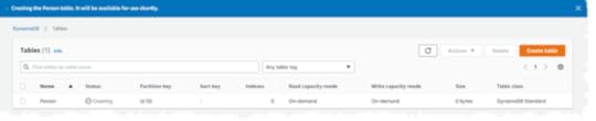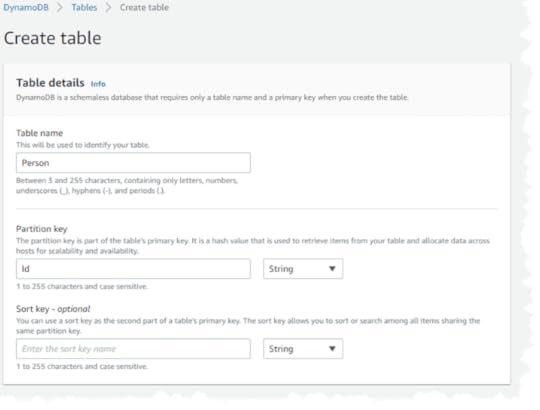 Figure 1. Creating a DynamoDB tableThere are three different values that you can enter. The first, Table name, is straightforward and needs to be unique by region. We used “Person” to identify the type of data that we are going to be storing in the table. The second value is the Partition key and the third value is an optional Sort key. A simple primary key is made up only of the partition key, and no two items in the table can share the same partition key. A composite primary key, on the other hand, is made up of both a partition key and a sort key. All items with the same partition key are stored together, sorted by the sort value. If using a composite primary key, you can have multiple instances of a partition key, however, the combination of partition key and sort key must be unique.