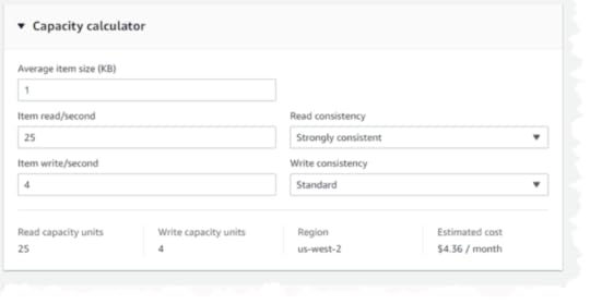 Next comes the Capacity calculator section. This is an interesting tool that helps you translate your typical (or predicted) usage into the generic Read and Write units that are used for configuration, pricing, and billing. You will need to expand the section before it becomes fully available, but when you do you will get a series of fields as shown in Figure 2.