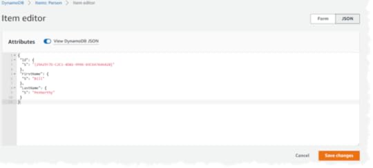 Figure 4. Creating an item in Amazon DynamoDB.If this format seems a little unusual, it is because this is the DynamoDB JSON, which is different from “traditional” JSON in that it stores the items as their own key/value pairs. If you turn off the View DynamoDB JSON selector at the top, then you will see the more standard JSON: