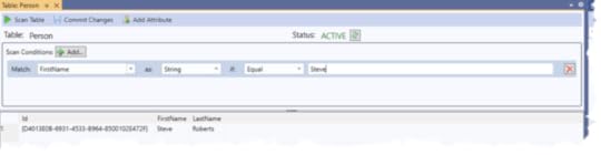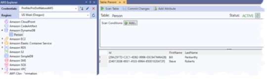Figure 5. Using the Toolkit for Visual Studio to view DynamoDB itemsYou can even use the toolkit to filter returns by selecting the Add button within the top box. This will add a line with a drop-down that includes all of the field names (Id, FirstName, and LastName) and allow you to enter a filter value. Selecting “LastName” “Equal” “Steve” and then clicking the Scan Table button will result in only one result remaining in the list as shown in Figure 6.