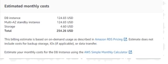 Figure 2. Estimated monthly costs with standby enabledOnce you have selected the appropriate availability option, in this case we chose to enable a standby instance, the rest of your experience will be the same as it was for MySQL, setting up Database authentication and Additional configuration. You can keep the defaults in these sections and go ahead and create your database or change the values as desired to get a better understanding of each area.