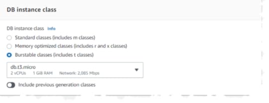 The next section allows you to select the DB instance class. You have the same three filters that you had before of Standard classes, Memory optimized classes, and Burstable classes. Selecting one of the filters changes the values in the instance drop-down box, You need to select Burstable classes and then one of the instances with micro in the title, such as a db.t3.micro as shown in Figure 3.