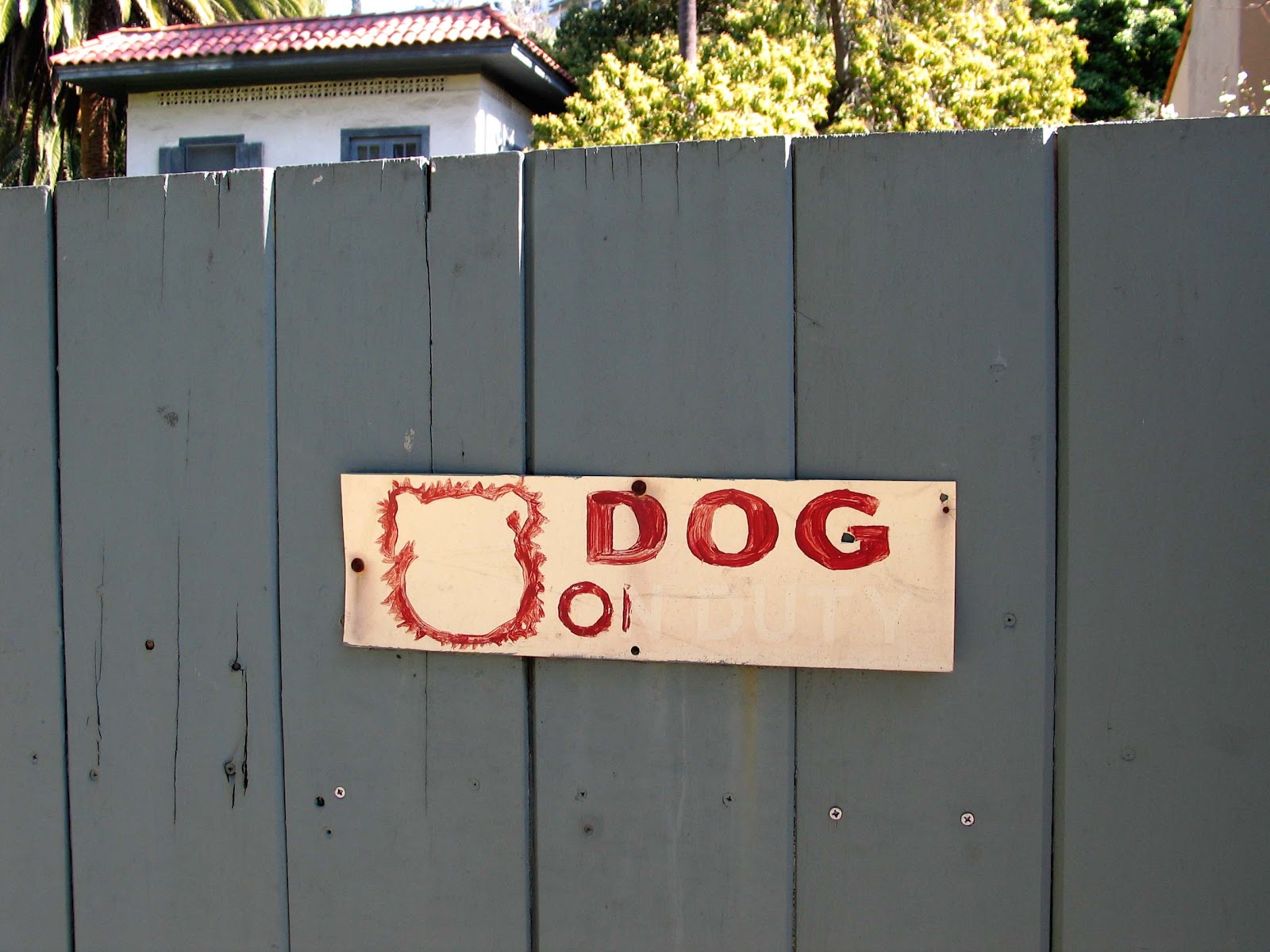 It's actually on the fence of a motel – the Desert Inn, a place that looks a good deal more inviting from the front than it does from the back. Of course, it seems a little unlikely that a wild dog would actually be let loose to roam the space behind a motel but you wouldn't want to stroll in there and take your chances, would you? You could even argue that if you really had a dog there'd be no need for a sign at all, although we know that isn't always true.