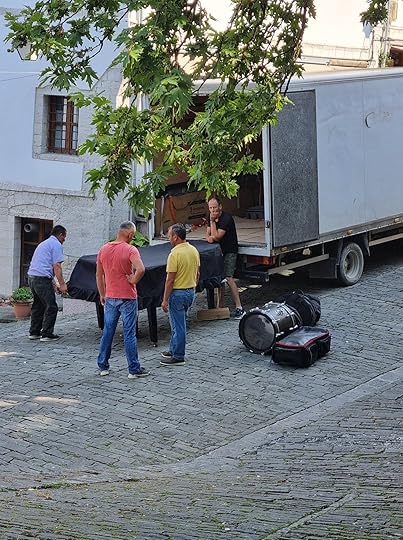 A bit like my actual home…except its in Gjirokaster AlbaniaOnly…now I’m better I like Albania a lot. People on the street say hello back even if they don’t know you. Old ladies in black have sweetly wizened smiles. People leave their luggage unattended and come back an hour later to find it still there (generally). Bus drivers don’t worry about silly little things like seatbelts and schedules. A woman paid my fare on the bus for no reason at all that I could see, and just beamed at me by way of explanation. I like their amusing signs, and their flag, which looks like a bug. I like the way the shy, narrow-faced young waiters don’t really know how to smarm tourists; I guess somebody’s nephew needs a bit of pocket money. I like the mountains, which are seriously Transylvanian in vibe, and the fact that nobody’s allowed to hurt bats here. (Note: the second pic is of a gaggle of men trying to decide what to do with a grand piano they’ve just unloaded. Roll it down the cobbles? Or…)