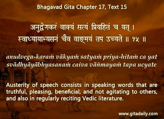 17.15: Austerity of speech consists in speaking words that are truthful, pleasing, beneficial, and not agitating to others, and also in regularly reciting Vedic literature.