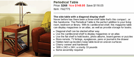 You are less likely to be familiar with the periodical table table. A company called Levenger offers it for sale. The periodical table table is a storage and display receptacle for magazines and other periodical publications. (Thanks to investigator Thomas Michel for bringing it to our attention.)