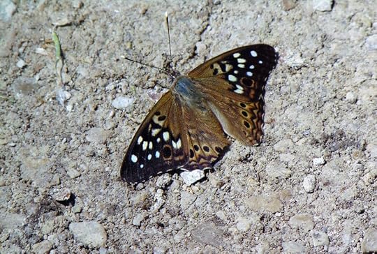 HackberryEmperors do not occurin my usual stomping grounds. But they are common at Pelee where they oftenperch cooperatively on the ground as this one did. The elegant study of brownswith white highlights makes them appear quite regal. This one narrowly escapeda predator to which the chomp out of the wing edge attests.